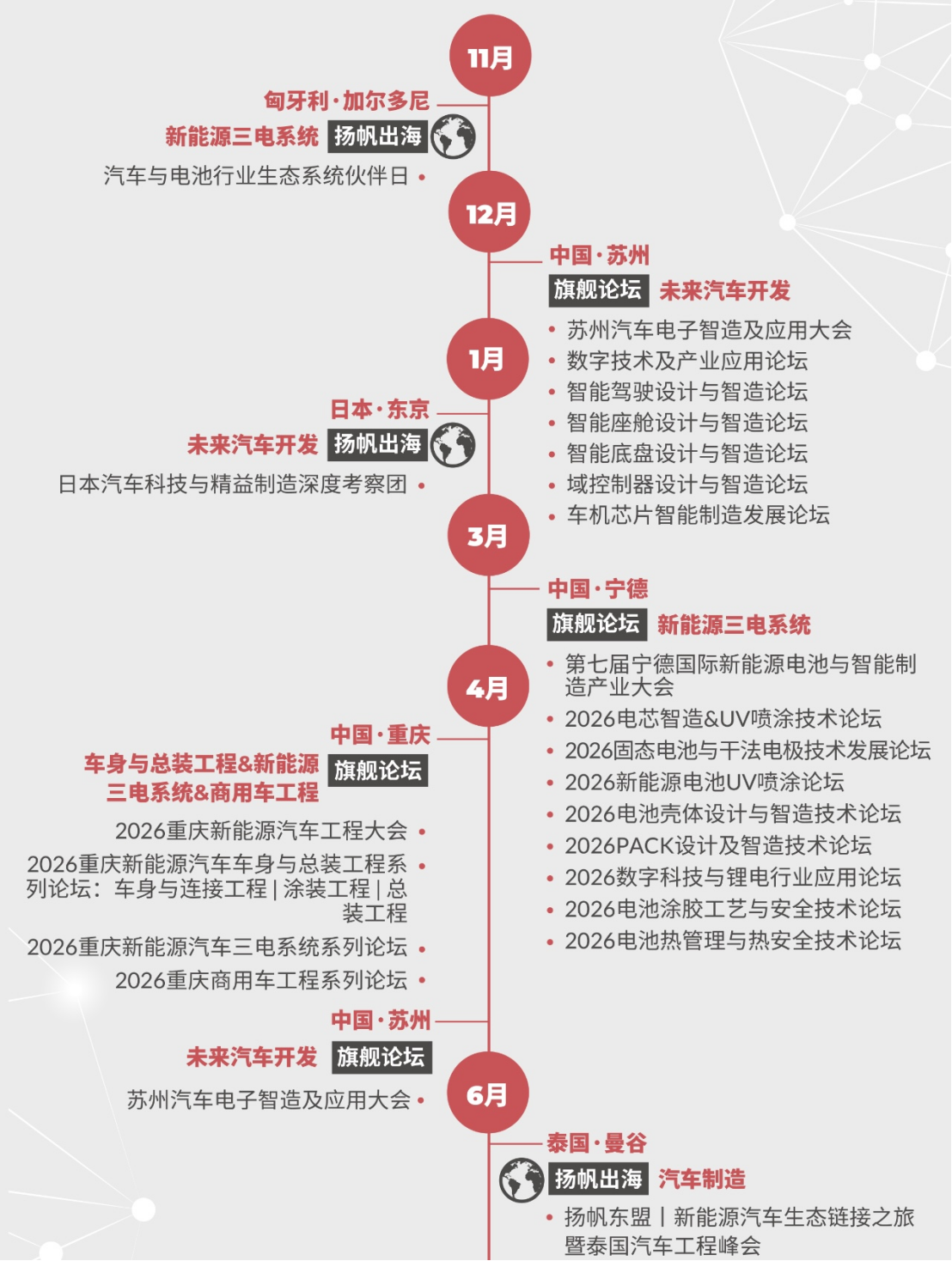 2026年,我们将推出多种活动形式,覆盖旗舰论坛、闭门峰会、主题系列会议、Workshop科技工坊、Techshow高新科技发布、圆桌对话、科技导览、扬帆出海、先锋奖项、走进智造、商务酒会等全维度活动,为您呈现一场多元化的创新生态体验。从聚焦冲焊涂总工艺的新能源工程大会、探索前瞻开发与测试技术的专业论坛,到深度研讨前沿科技的TechShow & Workshop;从沉浸式国内外智造产线工厂考察,到促进深度链接的圆桌会议、交流晚宴与精准配对,通过旗舰峰会、主题会议、Workshop科技工坊、出海及商务考察等全维度活动打造集技术洞察、知识共享与商业合作为一体的高端平台。