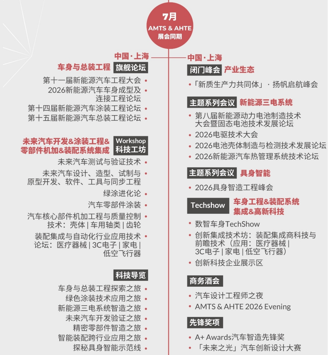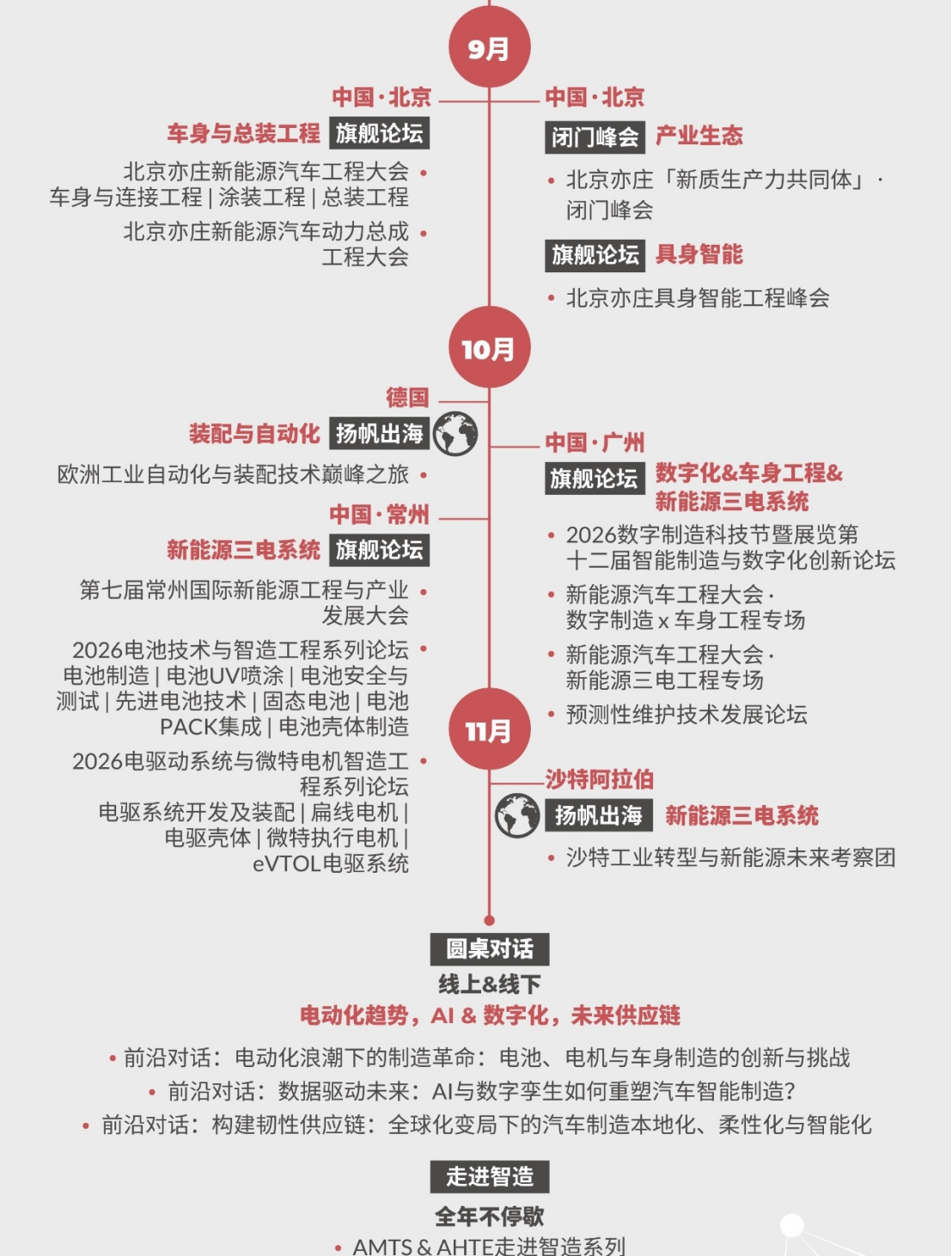 2026年,我们将推出多种活动形式,覆盖旗舰论坛、闭门峰会、主题系列会议、Workshop科技工坊、Techshow高新科技发布、圆桌对话、科技导览、扬帆出海、先锋奖项、走进智造、商务酒会等全维度活动,为您呈现一场多元化的创新生态体验。从聚焦冲焊涂总工艺的新能源工程大会、探索前瞻开发与测试技术的专业论坛,到深度研讨前沿科技的TechShow & Workshop;从沉浸式国内外智造产线工厂考察,到促进深度链接的圆桌会议、交流晚宴与精准配对,通过旗舰峰会、主题会议、Workshop科技工坊、出海及商务考察等全维度活动打造集技术洞察、知识共享与商业合作为一体的高端平台。